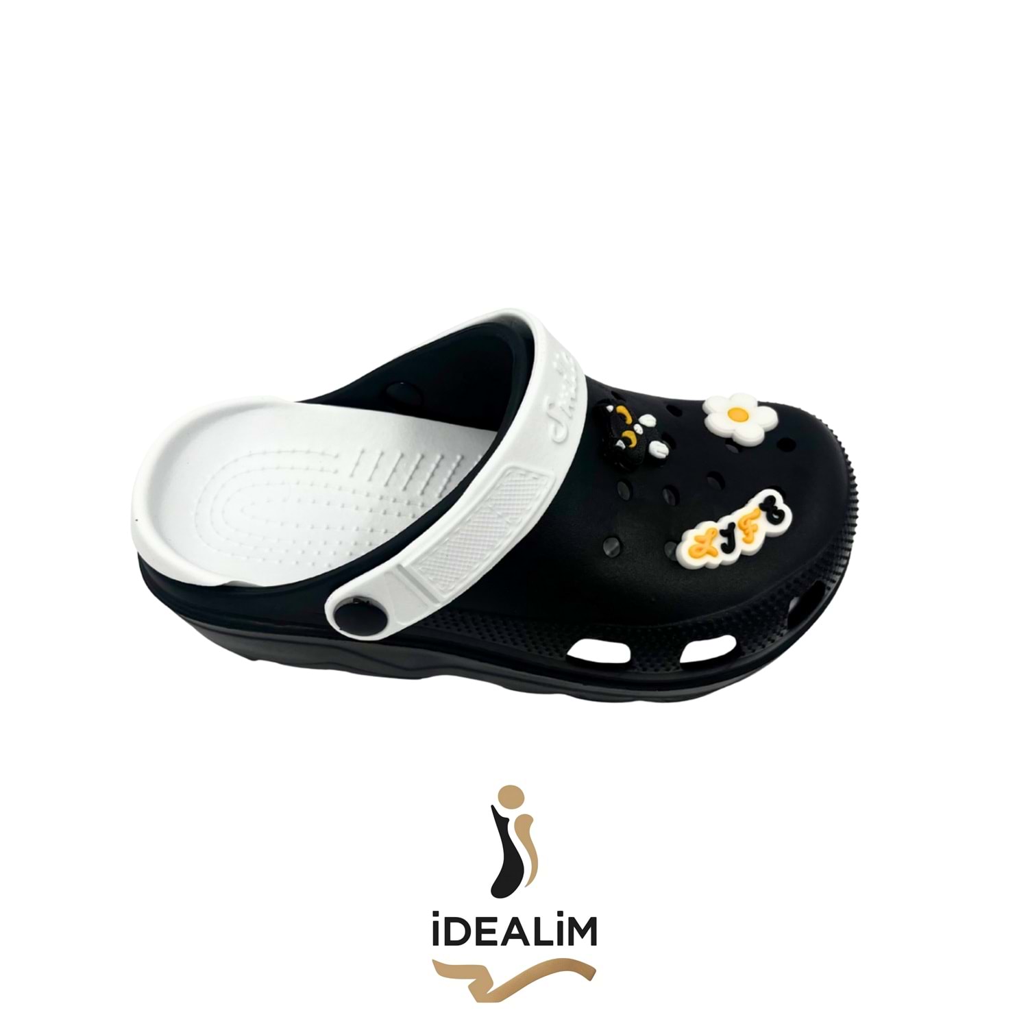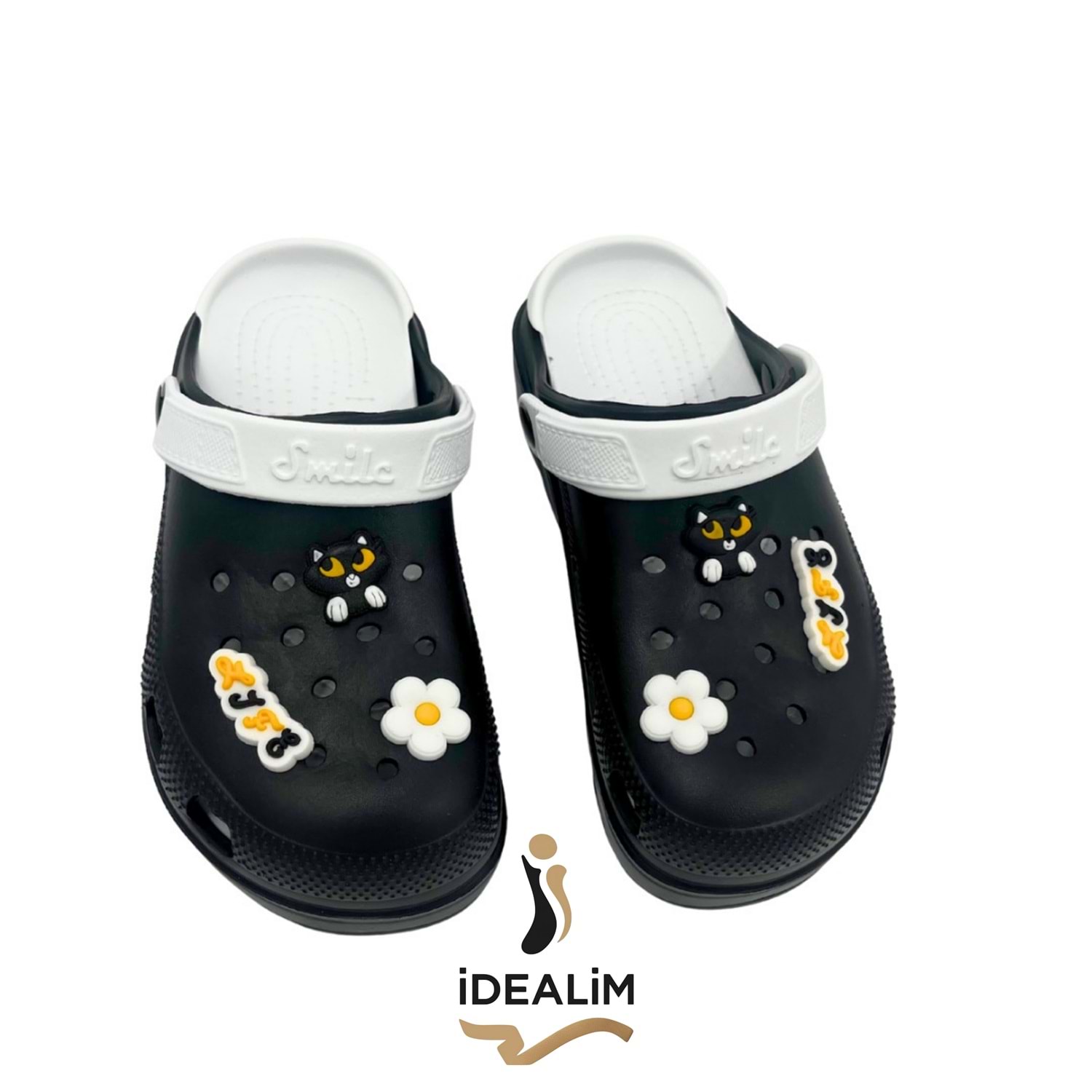 Kadın Siyah-Beyaz Smile Bantlı Dekoratif Delikli Terlik – Eğlenceli Yazlık Model Şık ve enerjik tasarımıyla öne çıkan kadın siyah-beyaz Smile terlik, yaz aylarının en konforlu ve eğlenceli modellerinden biridir. Hafif eva tabanı ile uzun süreli kullanımda bile rahatlık sağlar. Üst kısmındaki kedi figürü, çiçek süsleri ve yazı detayları modele neşeli bir hava katarken, arka bant üzerindeki “Smile” yazısı dinamik bir görünüm sunar. Renk: Siyah – Beyaz Cinsiyet: Kadın Malzeme: Hafif eva taban Detay: Kedi figürü, çiçek ve yazı süslemeli Bant: Beyaz "Smile" yazılı arka bant Özellik: Kaymaz taban, suya dayanıklı, kolay temizlenir Kullanım Alanı: Günlük, ev, bahçe, plaj